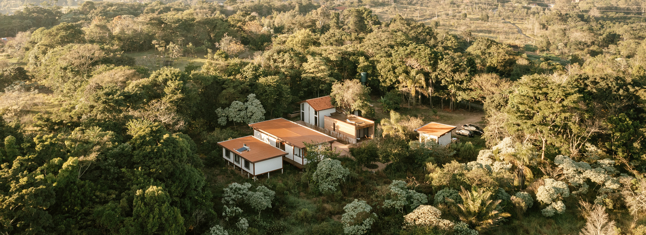 Em um terreno de 5mil m2 inserido na região da Demétria de Botucatu (São Paulo SP- Brasil), a Casa Hibisco de 420m2 se mostra de maneira exuberante através da vegetação rasteira do Cerrado paulistano e da mata atlântica, trazendo em si a história dos recursos encontrados na região e a preocupação sobre seu impacto no ambiente que é inserida. A premissa estrutural da casa está nos pilares de Aroeira, que são provenientes da antiga construção que havia no local: uma pequena residência cuja estrutura e fundação foram utilizados como ponto de partida para o novo lar da residência de Tatiana Antunes e do Instituto Saúva – um programa de Residência Artística fundado pela cliente. Outra técnica utilizada para enaltecer os recursos locais foram as 3 paredes de Taipa de Pilão, também presentes na residência principal; onde a terra em sua composição provém da região com a intenção de protagonizar as cores do Cerrado paulistano. A base para as 3 paredes estruturais foi feita em concreto ciclópico a partir do reuso de tijolos da demolição da casa original. O projeto é dividido em duas partes principais, uma delas sendo a Casa da proprietária e moradora como ambiente de lazer principal e um deck de madeira elevado; as outras duas edificações representam a segunda linguagem estrutural do projeto: feita em estrutura metálica em tons de vermelho-bordô, pode-se encontrar os quartos da residência artística e o ateliê completamente equipado para a experiência imersiva do processo artístico para o Instituto, que foram projetados nessa linguagem para que pudessem ser rapidamente edificados e de fácil manutenção, sem causar muito impacto para os biomas locais.